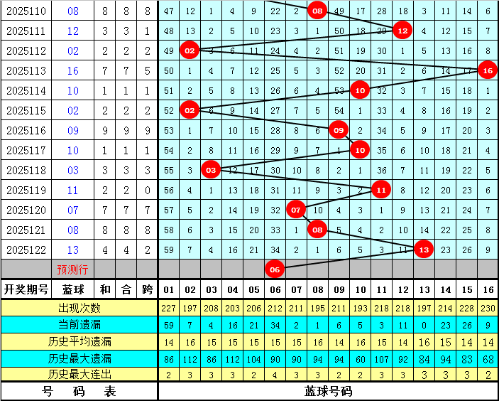 蓝球分析:在第123期历史同期开奖中,蓝球共开出了12个,重复蓝球出现频次较高,其中蓝球02、05、06、07、10、16在历史同期中都有重号,蓝球01、03、04、09、14、15在历史同期中都只出现了1次,蓝球08、11、12、13没有出现,今年第123期注意历史同期高频号码出现,看好蓝球号码06。