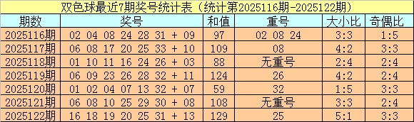开奖回顾:双色球第2025122期奖号为:16 18 19 20 25 31 + 13,红球和值为129,奇偶比为3:3,大小比为5:1。蓝球开出奇数。