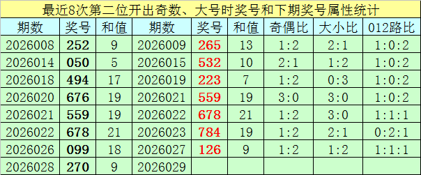 前7次第二位号码开出奇数、大号时奖号分别为:252、050、494、676、559、678、099,其中奇偶总比例为10:11,有5期奇偶比与上期奇偶比相同;号码大小总比例为14:7,有3期奖号大小比与上期大小比相同;