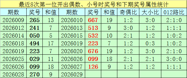 前7次第一位号码开出偶数、小 号时奖号分别为:265、241、050、494、223、029、099,其中奇偶总比例为8:13,有6期奇偶比与上期奇偶比相同;号码大小总比例为7:14,有3期奖号大小比与上期大小比相同;