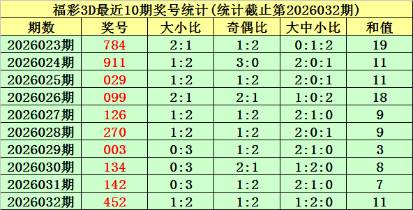 开奖回顾:福彩3D第2026032期奖号为:452。奖号类型为组六,和值为11,奇偶比为1:2,跨度为3,012路比为0:1:2,大小比为1:2。