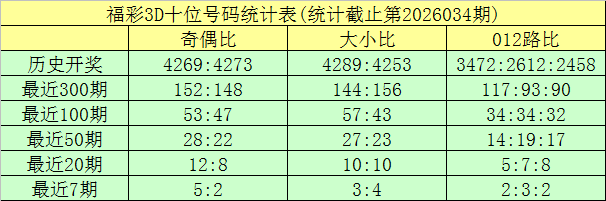 开奖回顾:福彩3D第2026034期奖号为:052。奖号形态开出组六,奇偶比开出1:2,012路比为1:0:2,大小比为1:2。