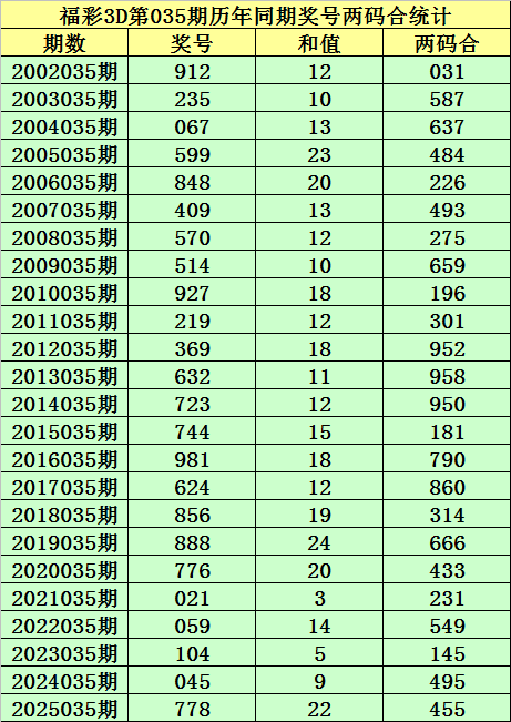 福彩3D第035期,历史上期开出24次奖号,其奖号分别为:912、235、067、599、848、409、570、514、927、219、369、632、723、744、981、624、856、888、776、021、059、104、045、778,奖号两码合差分别开出: