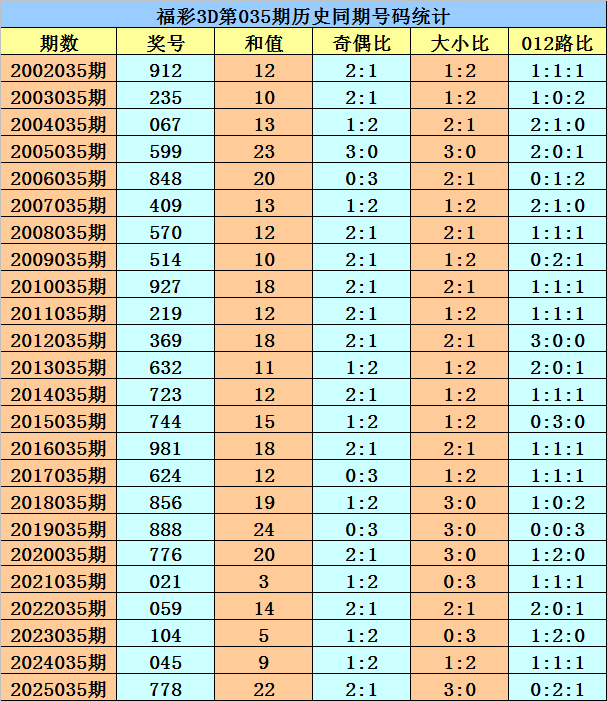 福彩3D第2026035期开奖日期:2026年2月4日,历史上第035期已开出了24次奖号,历年同期号码分别为:912、235、067、599、848、409、570、514、927、219、369、632、723、744、981、624、856、888、776、021、059、104、045、778。