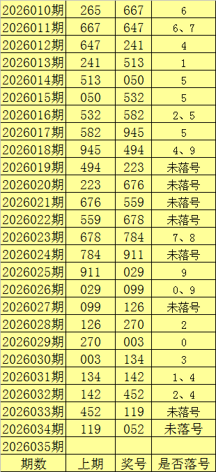 福彩3D第2026034奖号052,重号未落号。在最近100期(第2025286期-2026034期)中,重号落号72期;最近20期重号落号概率为60%;最近10期重号落号概率为70%。本期防重号中号码轮空。