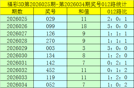 上期回顾:福彩3D第2026034期开出奖号:052。奖号为组六形态,与试机号有同号,奇偶比为1:2,大小比为1:2,012路比为1:0:2,和值为7,跨度为5。