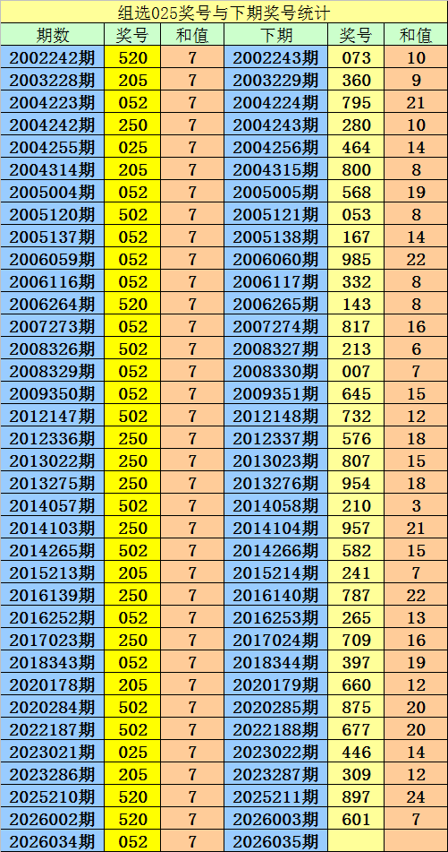 第2026034期3D奖号组选为:025,历史上该号码组选出现36次,下期号码分别为:073、360、795、280、464、800、568、053、167、985、332、143、817、213、007、645、732、576、807、954、210、957、582、241、787、265、709、397、660、875、677、446、309、897、601。