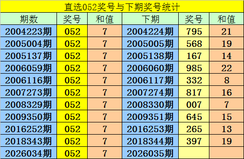 第2026034期3D奖号为:052,历史上该号码直选开出11次,下期号码分别为:795、568、167、985、332、817、007、645、265、397。