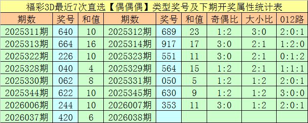 开奖回顾:福彩3D第2026037期开奖号码为420,奖号直选类型为:偶偶偶、小小小和120路。