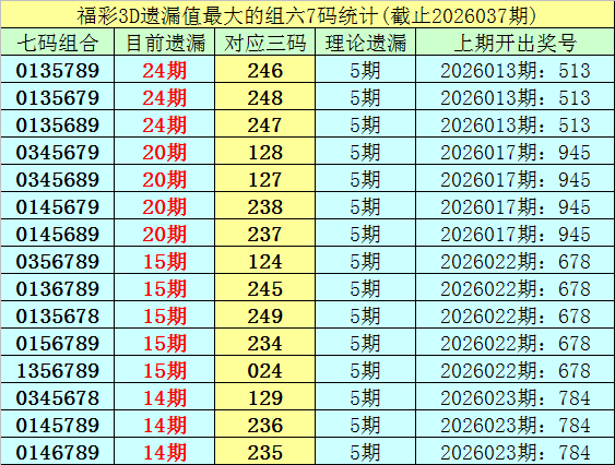 1.截止第26037期,七码组六遗漏最大的是:0135789、0135679、0135689,当前遗漏24期。