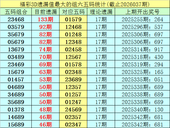 4.截止第26037期,五码组六遗漏最大的是:23468,当前遗漏133期。短期解冻的可能性较小,则26038期奖号分布在23468-01579之中的可能性最大。