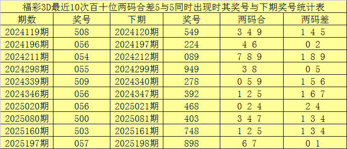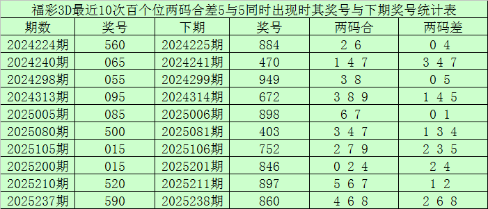 百个位合差分析:上期奖号百个位开出05组合,两码合为5,两码差为5,最近10次百个位两码合5与两码差5同时出现时,其奖号和下期奖号分别为: