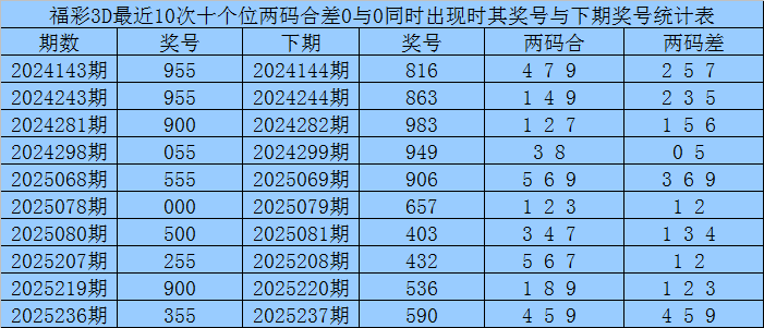 从以上统计可以看出,十个位两码合差0与0同时出现之后其下期两码合差表现最热的4个分别为:1235,本期十个位两码合差可以参考这四码中的数据。