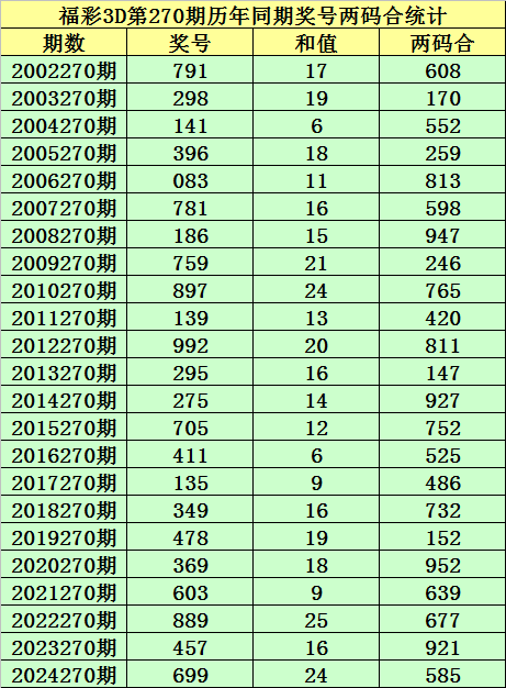 福彩3D第270期,历史上期开出23次奖号,其奖号分别为:791、298、141、396、083、781、186、759、897、139、992、295、275、705、411、135、349、478、369、603、889、457、699,奖号两码合差分别开出: