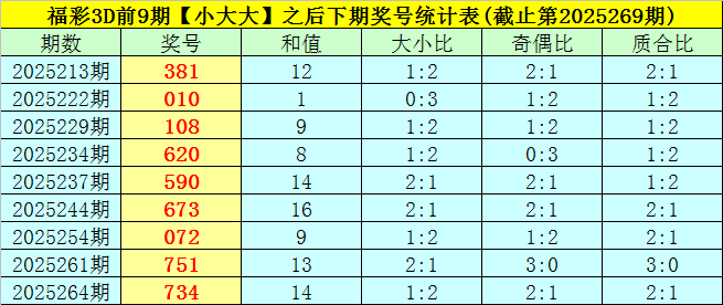 2、奖号质合比分别开出:1:2、1:2、1:2、2:1、3:0、2:1、2:1、1:2、1:2,总质合比开出14:13,其中有3期奖号质合比和上期奖号质合比相等;