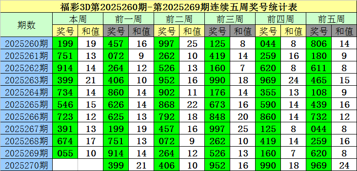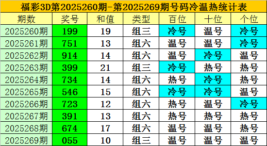 上期回顾:福彩3D第2025269期开奖奖号为:055,奖号类型为:组三,奖号冷温热态为:温号+温号+温号。