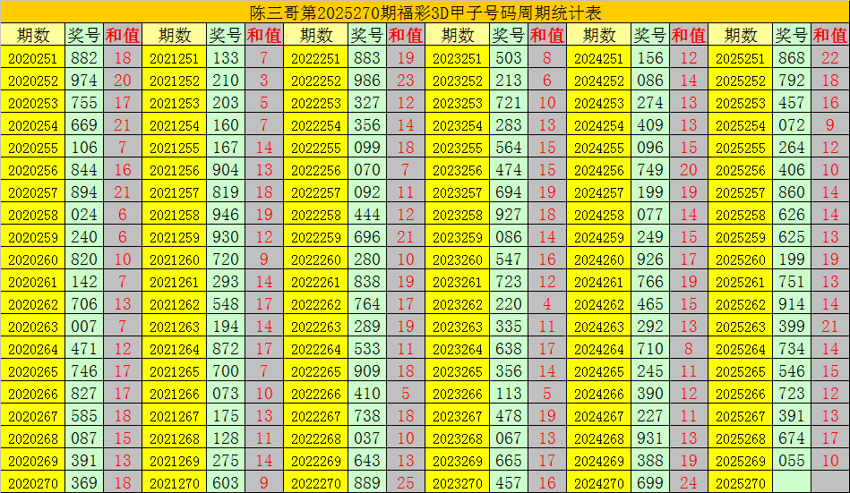 第2020年-第2024年的第255期奖号分别为:106、167、099、564、096,第2020年-2024年的第270期奖号分别为:369、603、889、457、699。其中:
