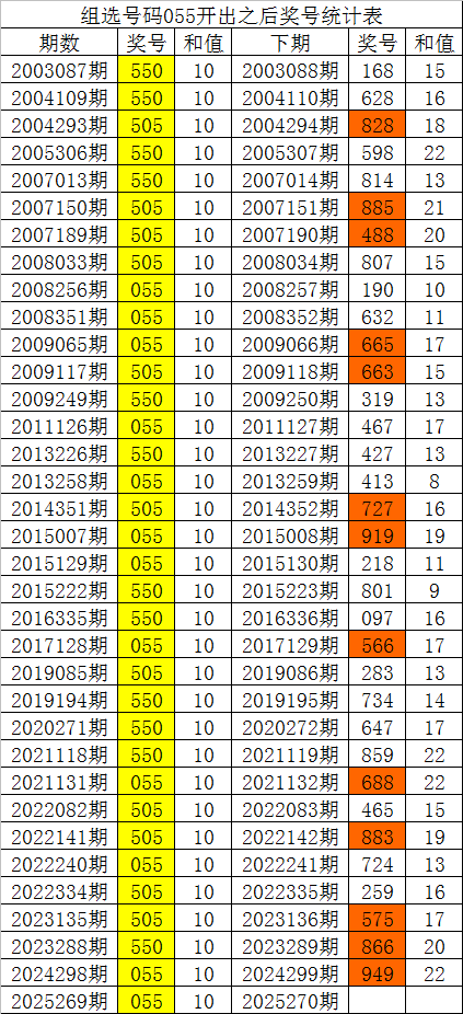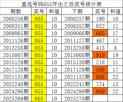 从以上统计可以看出,直选号码055出现之后,其下期奖号:1.下期合数出现概率100%;