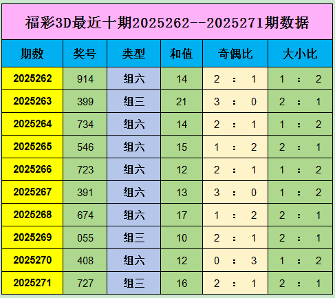 福彩3D上期开出奖号为727,奖号为组三形态,和值为16,奇偶比为2 : 1,大小比为2 : 1。