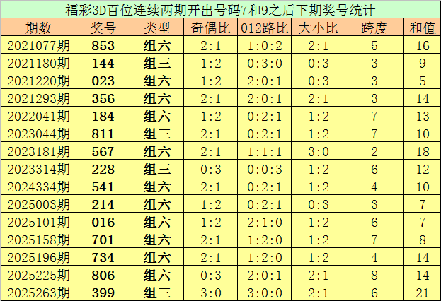 百位号码:连续两期百位出号分别为:7-9,历史上福彩3D连续两期前后分别出号7-9的奖号共出现81次。在百位7-9的奖号现象出现时,近15期下期分别出号:853-144-023-356-184-811-567-228-541-214-016-701-734-806-399;