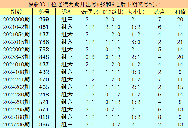 十位号码:前两期十位分别出现奖号2-6,历史上福彩3D连续前后分别开出号码2-6的现象共开出71次。在十位2-6的现象出现时,最近15期其下期分别开出号码:299-061-437-786-752-848-437-432-470-465-248-521-571-018-355;