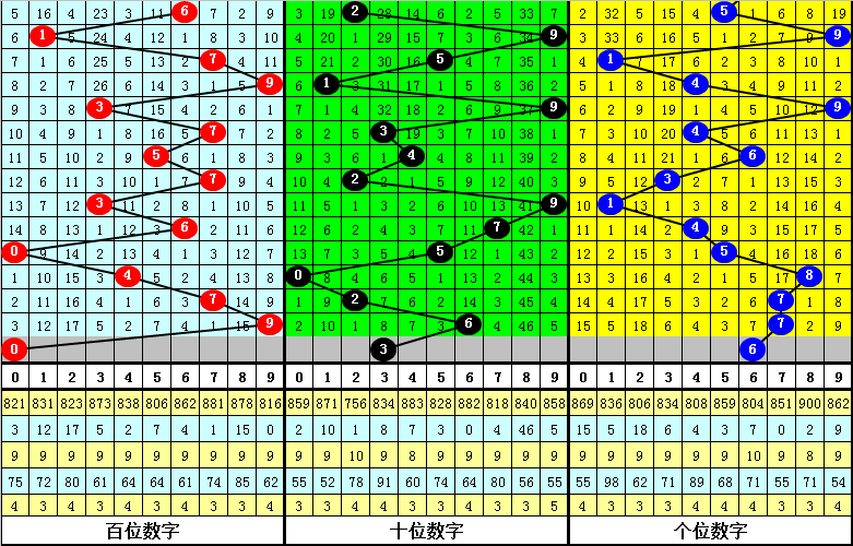 跨度分析:最近周二跨度出现范围在2-9区间,跨度比较集中,上周二跨度为5,跨度下降1个点位,本期看好跨度上升,参考跨度6。