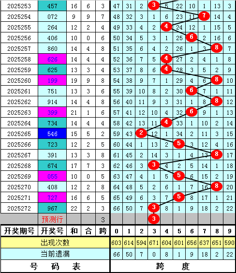 福彩3D第2025272期最大跨度开出3,近期最大跨度波动较大,本期预计最大跨度在1-5区段出现,最大跨度关注12345,重点关注跨度3。