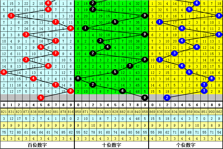 百位上期开出号码9,上升2点位,本期注意该位下降,参考号码5。