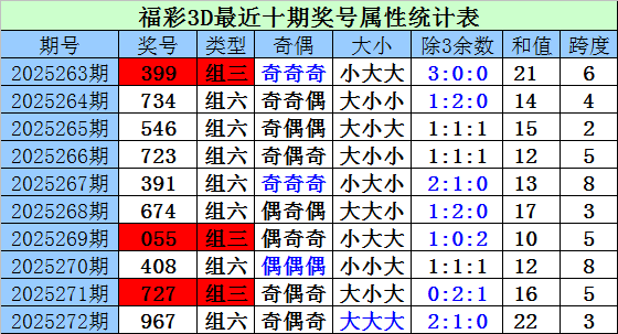 上期回顾:上期开奖奖号为967,类型:组六,奇偶奇,大大大,2:1:0,和值22,跨度3。