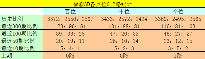 个位分析:该位最近10期开出了3个0路号码、5个1路号码、2个2路号码,1路号码热出,2路号码走冷。本期排除2路号码,参考号码:3。