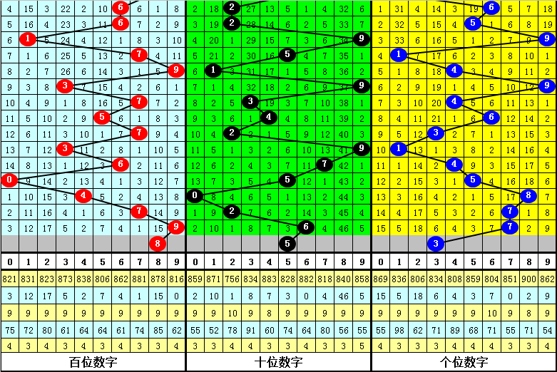 百位分析:该位最近10期开出了5个0路号码、4个1路号码、1个2路号码,0路号码热出,2路号码走冷。本期排除1路号码,参考号码:8。
