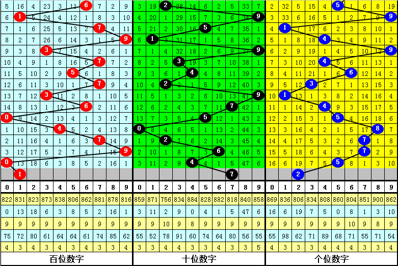 组选分析:在0-9的组选分布图中,最近10期0-2区段开出6个号码,3-6区段开出15个号码,7-9区段开出9个号码,上期7-9区间没有落号,本期预计号码主要在两端热出,防3-6区段走冷。