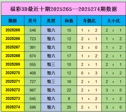 福彩3D上期开出奖号为596,奖号为组六形态,和值为20,奇偶比为2 : 1,大小比为3 : 0。