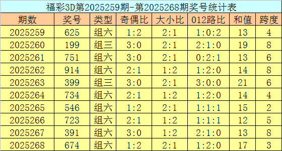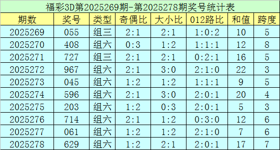 上期回顾:福彩3D第2025278期开奖号码为629,组选类型为组六,奇偶比为1:2,大小比为2:1。