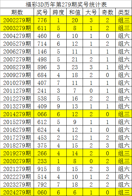 从以上统计可以看出,历年3D第279期开出了6次组三号码,开出了17次组六号码。组六号码出现概率大,本期预计开出组六号码。
