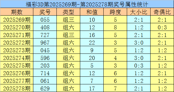 开奖回顾:福彩3D第2025278期开出奖号629。奖号形态为组六,奇偶比为1:2,012路比为2:0:1,大小比为2:1,和值为17,跨度为7。