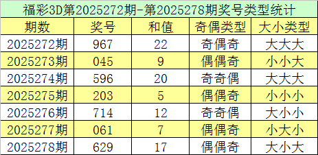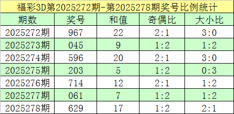 福彩3D第2025278期回顾:奖号为629,奖号奇偶比为1:2,大小比为2:1,和值为17,类型为组六。