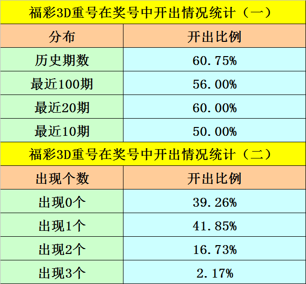 最近100期开奖中,含有重号的奖号有56期,最近20期含有重号的奖号有12期,最近10期含有重号的奖号有5期。本期排除重号。