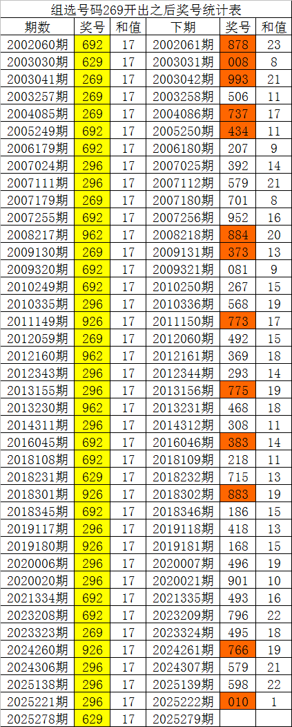 福彩3D第2025278期开出组选号码:269,该号码历史上组选出现了40次,其下期分别开出了号码:878、008、993、506、737、434、207、392、579、701、952、884、373、081、267、568、773、492、369、293、775、468、308、383、218、715、883、186、418、168、496、901、493、796、495、766、579、598、010,如图: