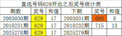 福彩3D第2025278期开出直选号码为:629,该直选号码历史上出现了3次,其下期分别开出了号码:008、715,如图:
