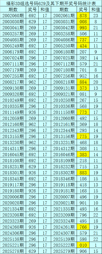 二、组选分析:历史上组选号码629开出了40次,其下期奖号分别为:878-008-993-506-737-434-207-392-579-701-952-884-373-081-267-568-773-492-369-293-775-468-308-383-218-715-883-186-418-168-496-901-493-796-495-766-579-598-010,其开出期数和下期奖号统计为: