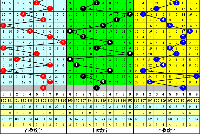百位号码:连续两期百位出号分别为:6-7,历史上福彩3D连续两期前后分别出号6-7的奖号共出现77次。在百位6-7的奖号现象出现时,近15期下期分别出号:933-125-729-376-994-194-954-851-817-681-480-705-640-275-458;