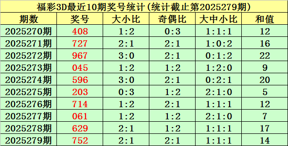 开奖回顾:福彩3D第2025279期奖号为:752。奖号类型为组六,和值为14,奇偶比为2:1,跨度为5,012路比为0:1:2,大小比为2:1。