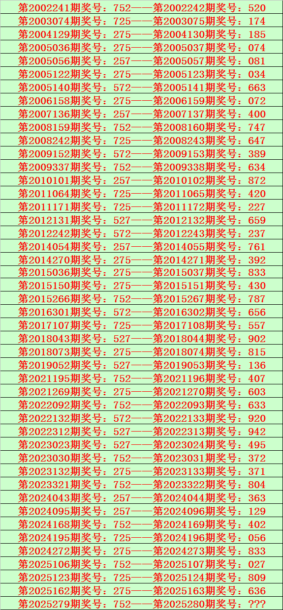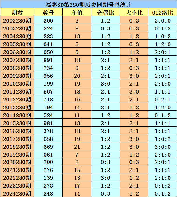 福彩3D第2025280期开奖日期:2025年10月21日,历史上第280期已开出了23次奖号,历年同期号码分别为:300、224、283、041、050、891、234、956、199、567、718、194、524、981、378、658、669、061、200、276、139、278、248。