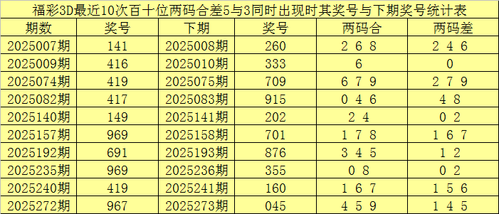 百个位合差分析:上期奖号百个位开出41组合,两码合为5,两码差为3,最近10次百个位两码合5与两码差3同时出现时,其奖号和下期奖号分别为: