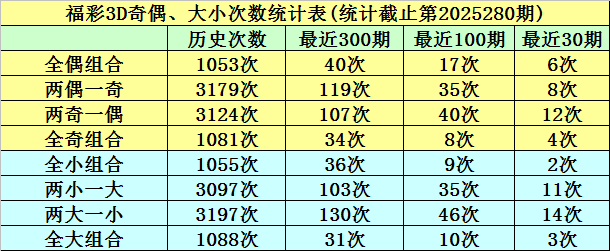 在前10期开奖中,全小组合出现2次,两小一大组合出现3次,两大一小组合出现3次,全大组合出现2次,本期预计开出两大一小组合。