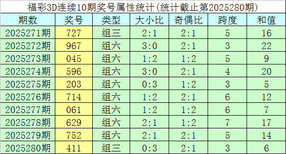 开奖回顾:福彩3D第2025280期奖号为411。奖号形态为组三,大小形态为小小小,奇偶形态为偶奇奇,和值为6,跨度为3。