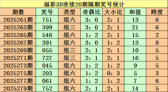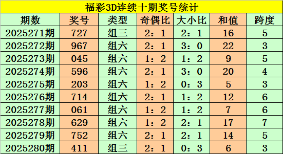 上期回顾:福彩3D第2025280期奖号:411。组三、小小小、偶奇奇。