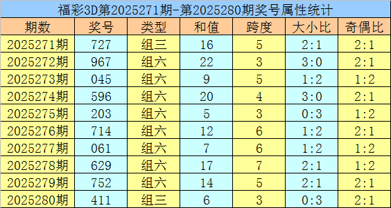 开奖回顾:福彩3D第2025280期开出奖号411。奖号形态为组三,奇偶比为2:1,012路比为0:3:0,大小比为0:3,和值为6,跨度为3。