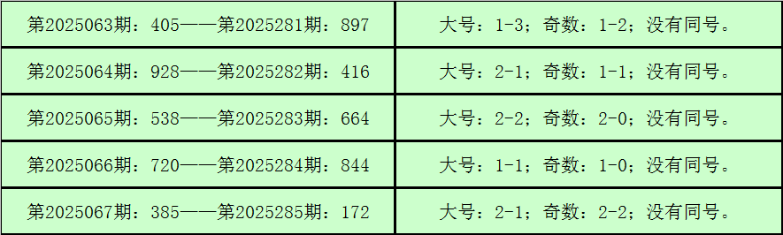 所以,3D第2025259期开出奖号:625,其大小比为2:1,奇偶比为1:2,012路比为1:0:2,与3D第2025286期奖号可能有同号。